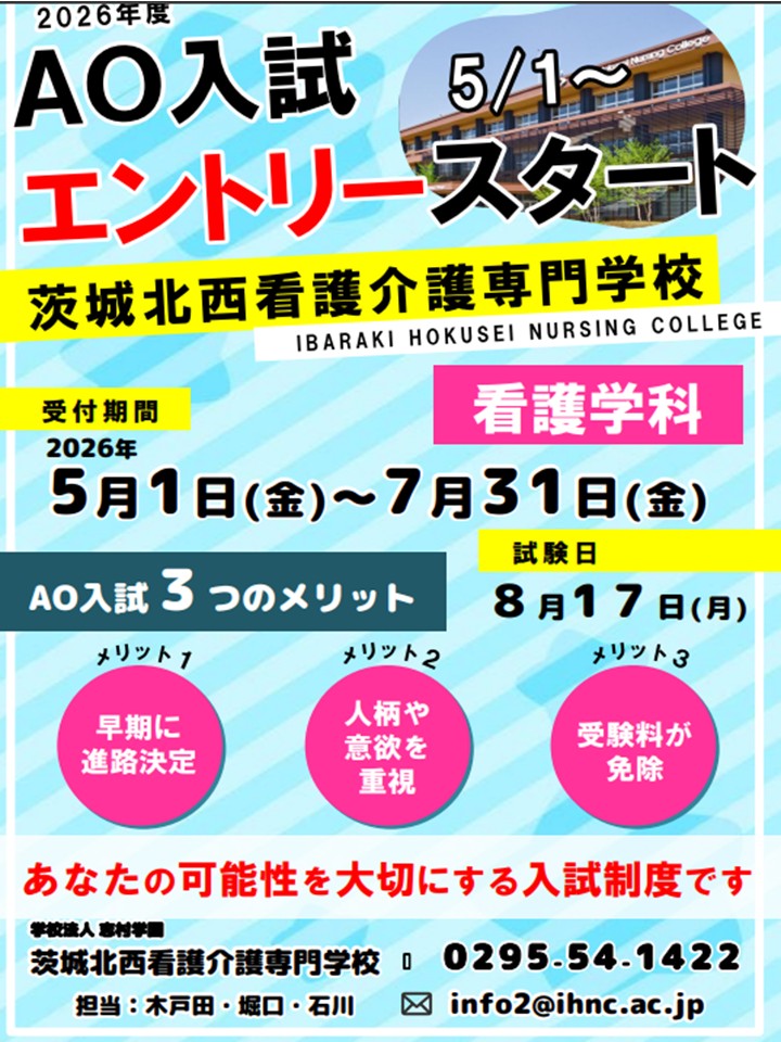 2026年4月14日 未分類 令和8年度 看護学科でも総合型選抜入試を導入します! 令和8年度 看護学科でも総合型選抜入試を導入します! 一覧へ戻る カテゴリ お知らせ・NEWS (18) 未分類 (11) 後援会NEWS (11) 個別相談 (1) 教員募集 (1) アーカイブ 令和8年度 看護学科でも総合型選抜入試を導入します! 令和7年度寄付金Web芳名録 令和8年度オープンキャンパス・入試案内(介護福祉学科) 令和8年度オープンキャンパス・入試案内(看護学科) 看護学科第5回入試願書受付け中!